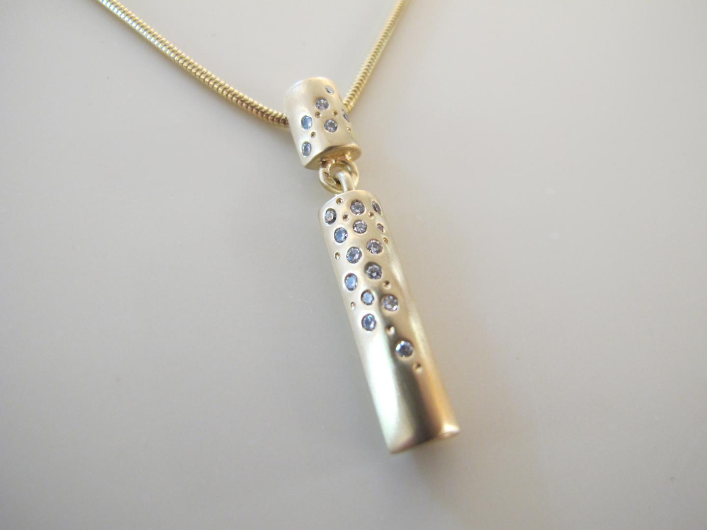 Transformation de vieil or cliente en un pendentif articulé en or jaune brossé, serti de vingt diamants taille brillant. Avec une chaine serpentine.